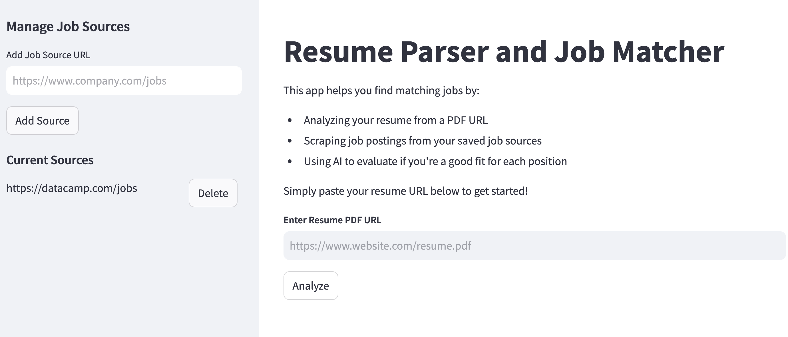 Each job listings source is added to a Supabase database under the hood for persistence and displayed in the sidebar (you have the option to delete them). After the user inputs all job sources, they can add their PDF link in the main section of the app.