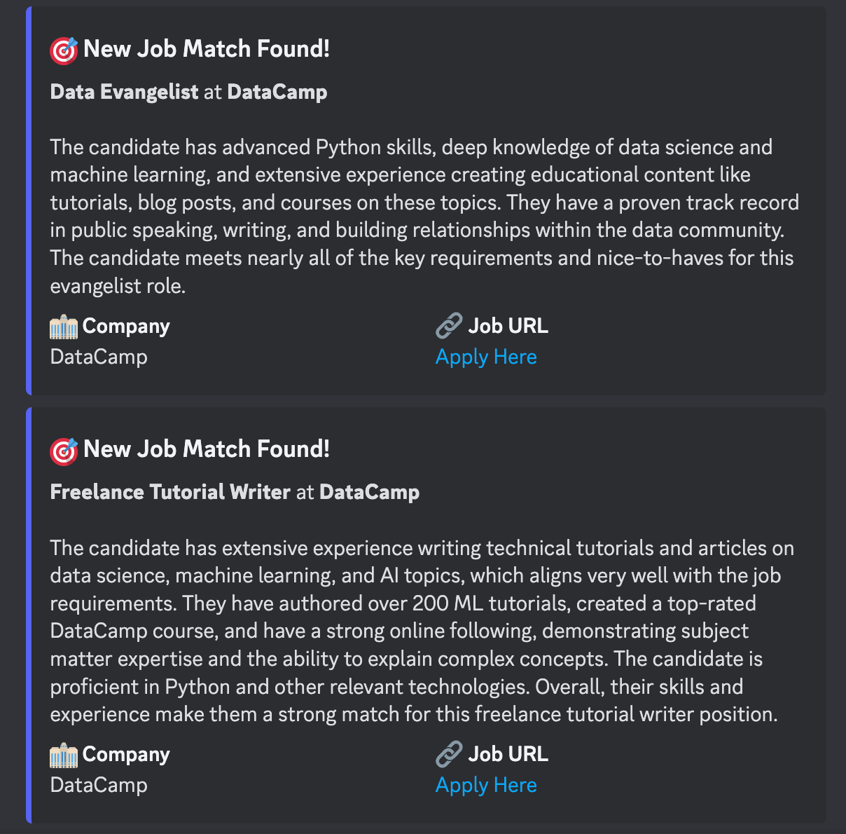 When a matching job is found, our system sends notifications through Discord webhooks. This might seem like an unusual choice, but Discord offers several advantages: