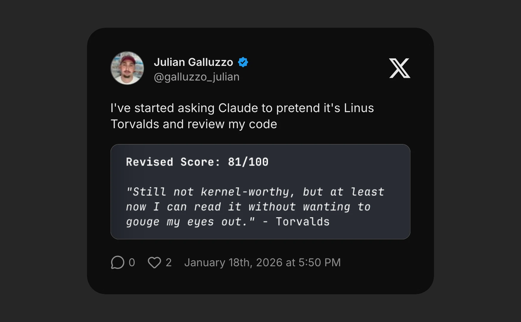 If you don’t want to use the plugin directly, you can always ask Calude Code to review like Linus Torvalds.