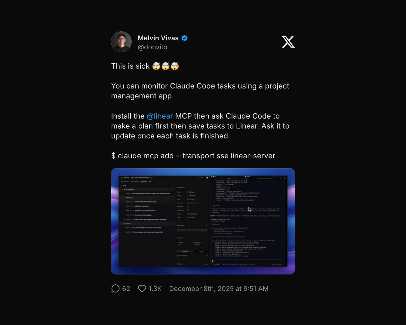 I’ve been using the Linear MCP plugin in Claude Code, and it’s changed how I work with tickets day to day. Being able to pull real issues directly into my coding flow and act on them without jumping tools makes the whole process feel tighter and more focused.