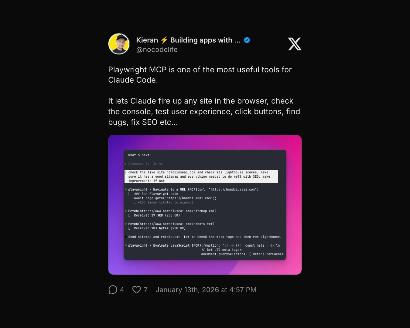 When working on my frontend projects, I use Playwright MCP to test my web apps through natural language instead of writing test scripts. I just tell Claude things like “test the checkout flow” or “fill out the contact form and submit it,” and it happens.