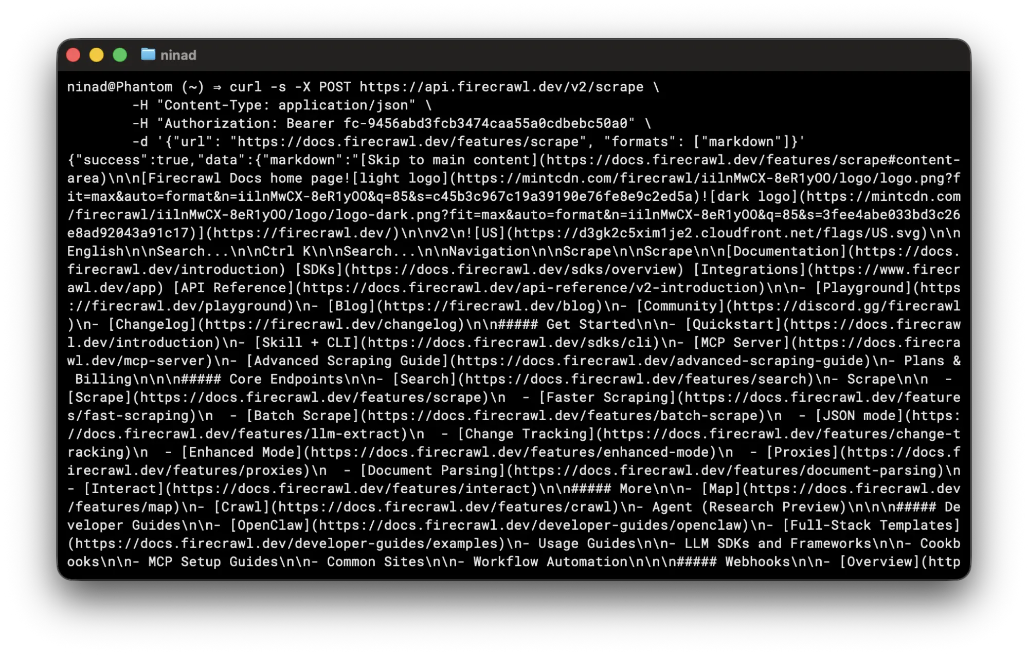 -d '{"url": "https://docs.firecrawl.dev/features/scrape", "formats": ["markdown"]}'This command provides you a JSON with the output type and a data key with the page markdown (or whichever format you requested).
