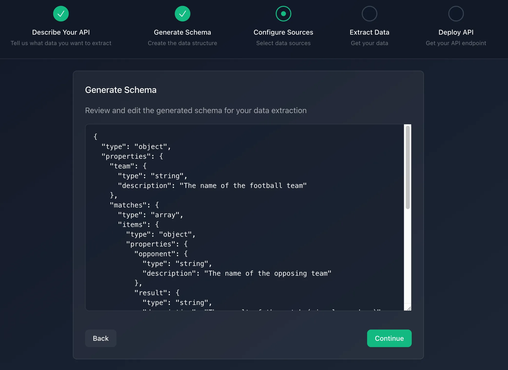 After describing your API, the LLM API Engine automatically converts your natural language description into a structured data schema. This crucial step bridges the gap between your plain English request and the structured data you'll ultimately receive.
