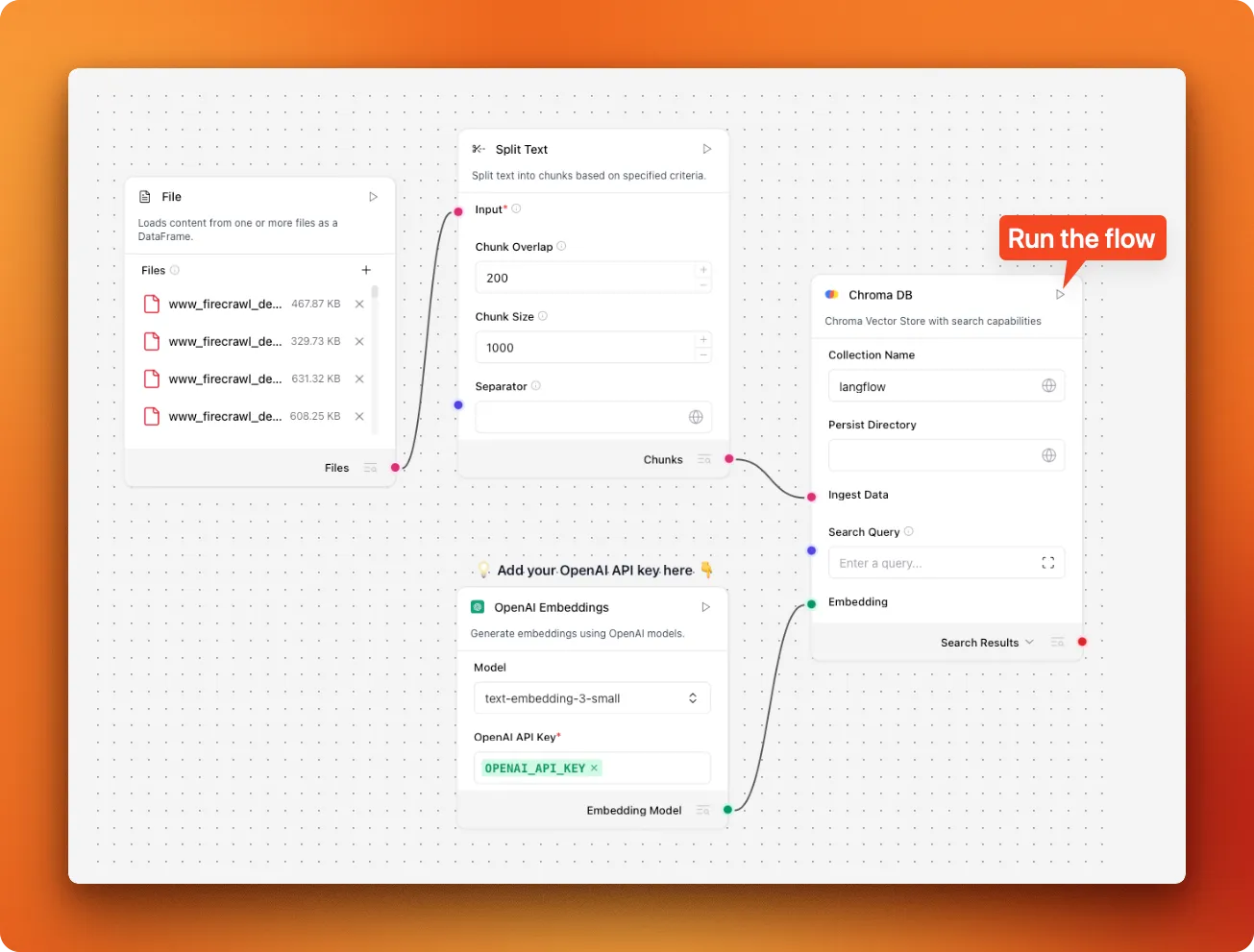This tutorial shows you how to build a complete PDF RAG application using LangFlow's pre-built template that handles many of these issues elegantly. You'll learn how to collect PDF documents at scale using Firecrawl's web-to-PDF conversion, set up the visual RAG workflow in LangFlow, and create an interactive chat interface for document question-answering. We'll also cover how to extend this foundation with custom improvements and explain why we chose a visual, template-based approach over building everything from scratch.